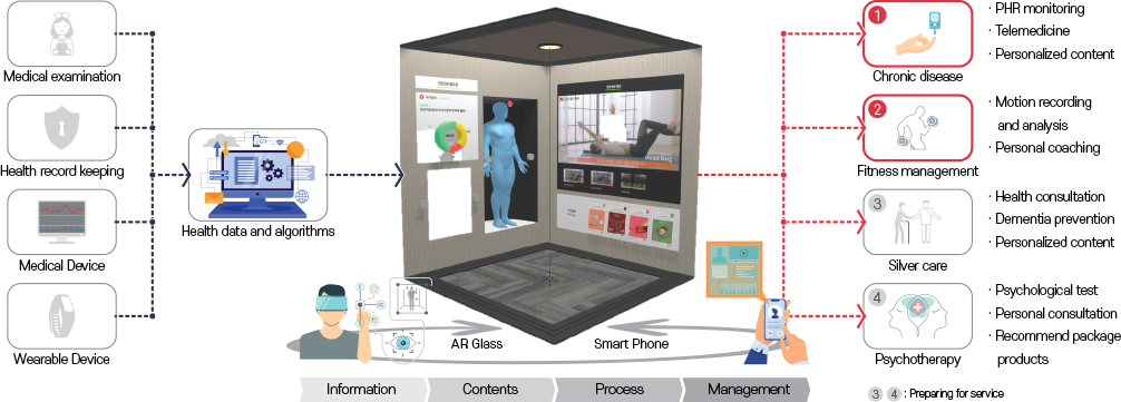 By providing 'My Health Room', an AR-based digital healthcare platform, various and practical healthcare activities are supported without space restrictions. 'My Health Room' conveniently manages medical data for chronic disease patients and provides customized services based on this.